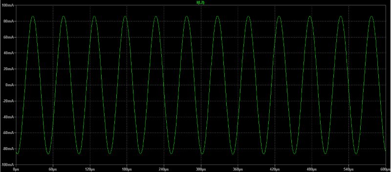 Пропоную схему, де Тх "включена" у резонансний контур, налаштований на частоту вищу від роботи IB металошукача. Це нам дає фазову стабільність наближену до нерезонансної схеми та значне зниження гармонік у сигналі що випромінюється. Котушка (L2) працює на частоті на 3кГц нижче частоти резонансу: Форма струму у котушці Тх (L2) синусна; сила струму більша ніж при нерезонансному включенні: