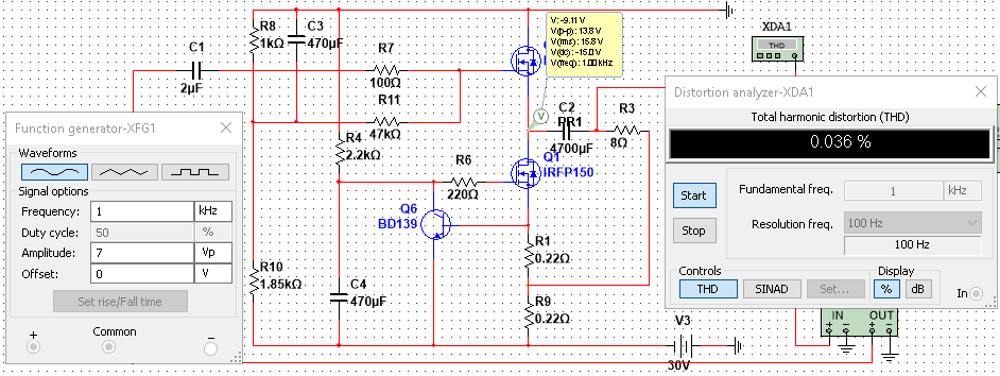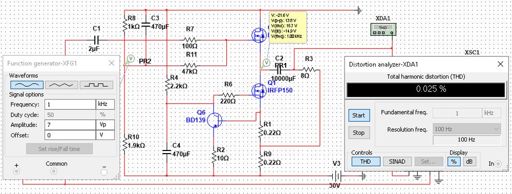 Змоделював схему підсилювача напруги на польових транзисторах для Power Follower Андреа Чуффолі; в моделі отримано THD 0.076%: