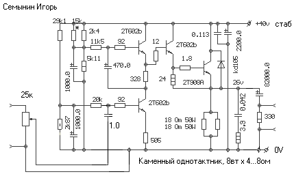 Однокаскадний однотактний підсилювач класу "А", вихідний транзистор увімкнений послідовно з генератором струму, має електронний фільтр у живленні. Все на однотипних потужних польових транзисторах. Навантаження увімкнуто ПАРАЛЕЛЬНО вихідному каскаду.