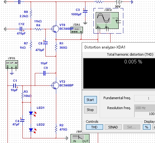 В результаті моделювання отримав схему неінвертуючого підсилювача напруги з коефіцієнтом гармонік 0.005%: