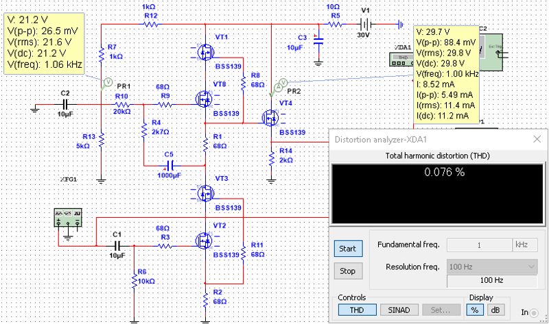 PS. Отриманий коефіцієнт гармонік є незначним. В однотактних підсилювачах переважають парні гармоніки, котрі суб'єктивно сприймаються набагато краще ніж непарні (характерні для двохтактного вихідного каскаду).
