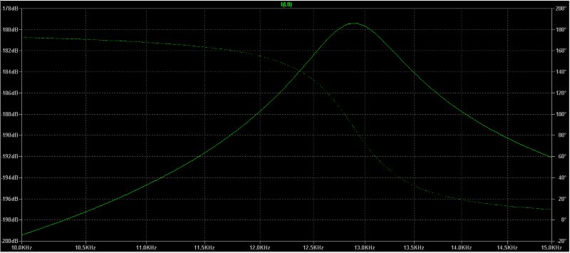 Змоделював у LTspice XVII роботу передаючої частини IB металошукача Fisher F75. Амплітудно-частотна і фазово-частотна характеристики відповідають схемі: