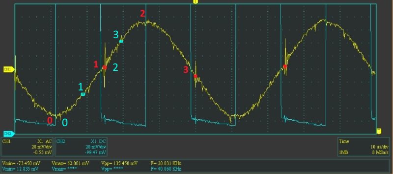 У темі IB металошукач на ARDUINO DUE я приводив осциллограму синхронізації Tx та RX. Для реалізації квадратурного детектора необхідно провести 2 вимірювання з інтервалом у 90 градусів (я проводжу 4 з тим же інтервалом для отримання більшої кількості вимірювань).