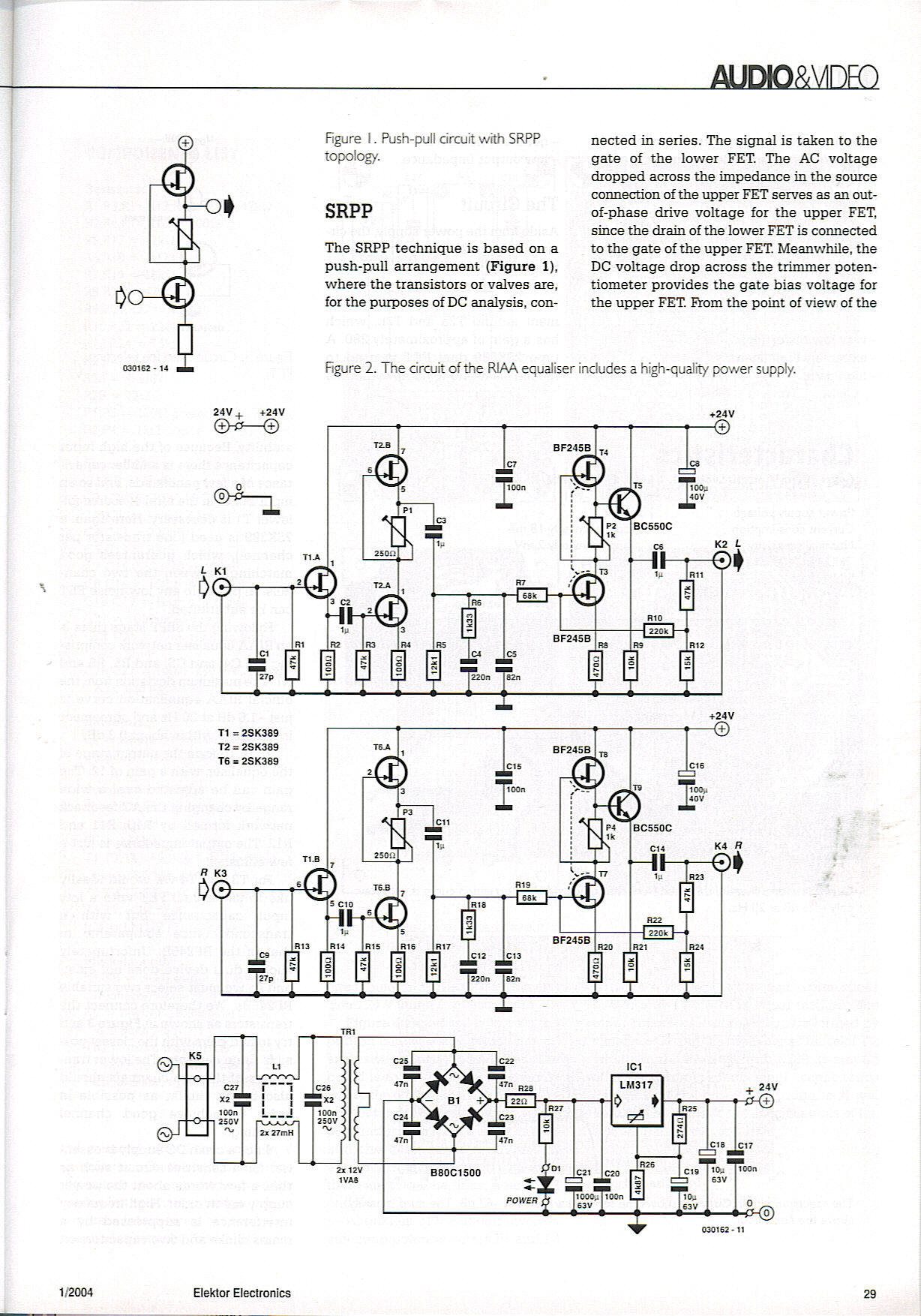 У 2004 році журнал Elektor опублікував схему коректуючого підсилювача на польових транзисторах: