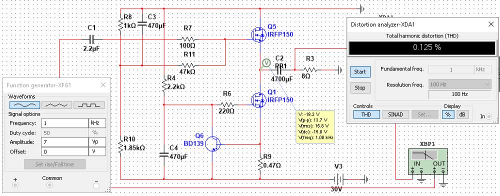 Змоделював схему підсилювача напруги на польових транзисторах для Power Follower Андреа Чуффолі; в моделі отримано THD 0.076%: