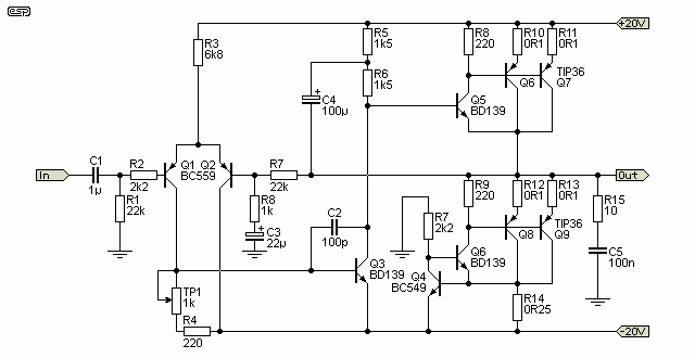 Rod Elliott в 1999 році запропонував схему 20 Watt Class-A Power Amplifier: