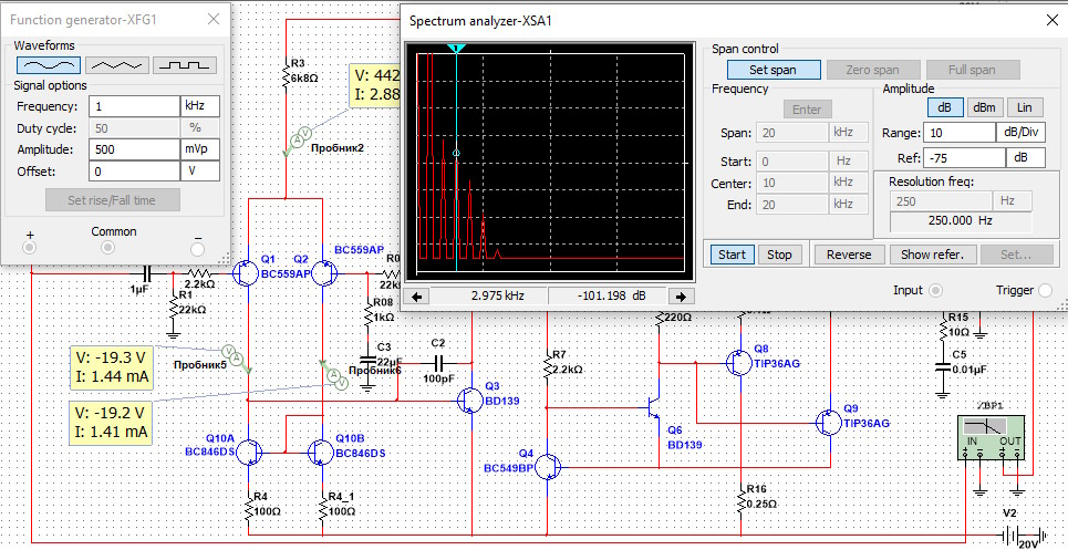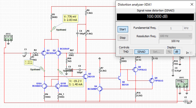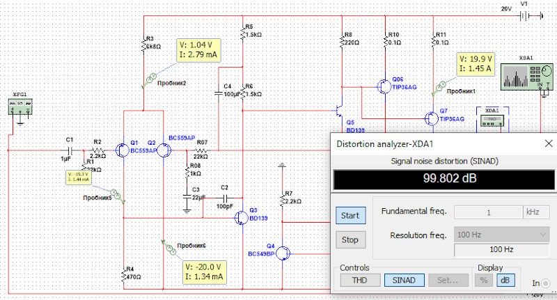 Так як автор заборонив копіювати статтю, викладу лише результати моделювання цього підсилювача в NI Multisim 14.1. На схемі повторюються позначення деяких елементів (R7, R8, Q6), тому "дублюючі" позначення я замінив на R07, R08, Q06