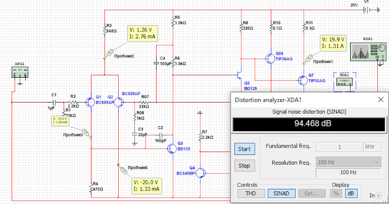 PS. В доданому архіві модель модифікованої схеми 20-ватного підсилювача в класі "А" (1999, Rod Elliott - ESPr) в NI Multisim 14.1