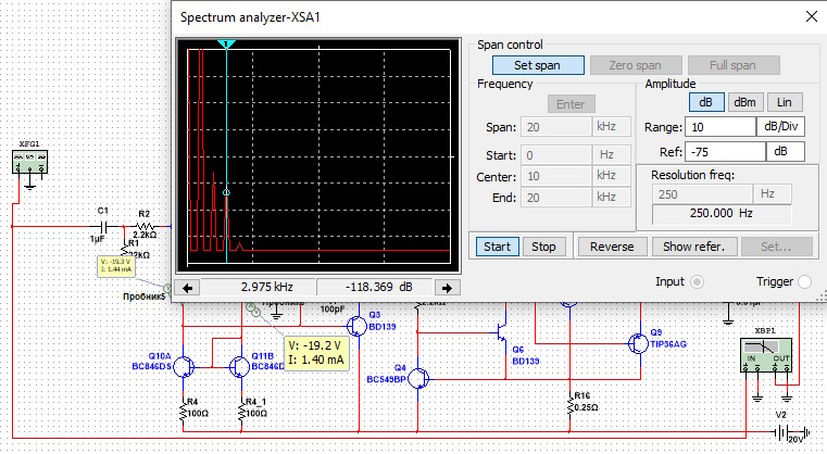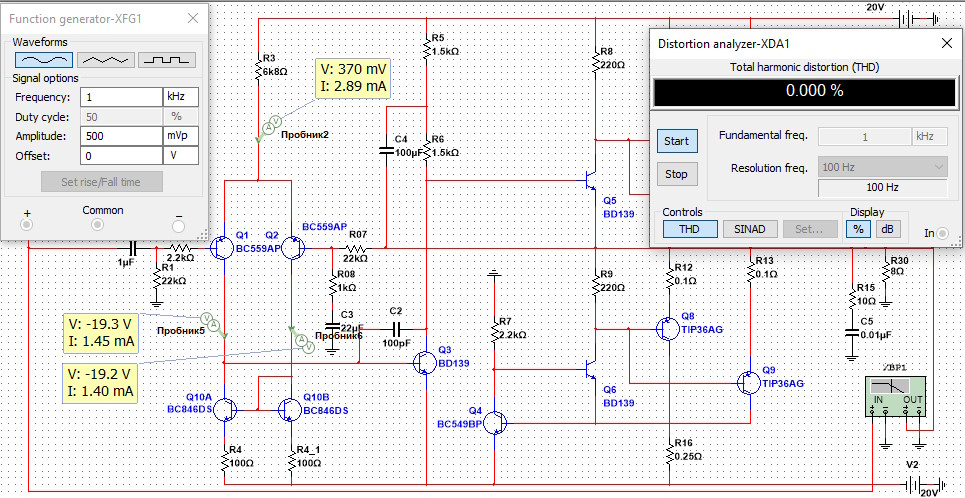 PS. В доданому архіві модель 20-ватного підсилювача в класі "А" (1999, Rod Elliott - ESPr) в NI Multisim 14.1