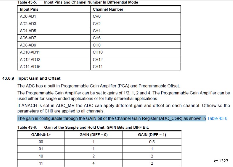 2)згідно даташиту, коефіцієнт підсилення в цьому режимі встановлюється, за замовчуванням, 0.5; для вирішення деяких завдань, коефіцієнт підсилення можна змінити за допомогою біта GAIN регістра ADC_CGR: