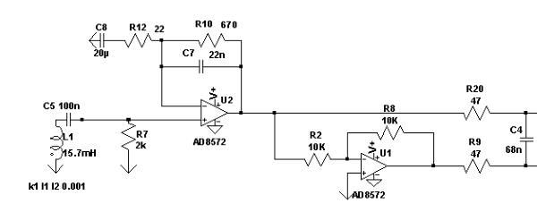 Вхідний підсилювач на ADA4841-2 (GBW=90MHz SR=12V/uS) широкосмуговий із фільтром НЧ на 50кГц: Низький коефіцієнт підсилення вхідного каскаду компенсується диференціальним включенням 18-розрядного АЦП AD7691 (18-Bit, 1.5 LSB INL, 250 kSPS). Схемотехнічне рішення інвертора фази вхідного сигналу не є оптимальним, так як не забезпечує точної різниці фаз у 180 градусів; вірогідно, це викликано комерційною доцільністю.