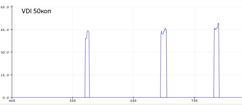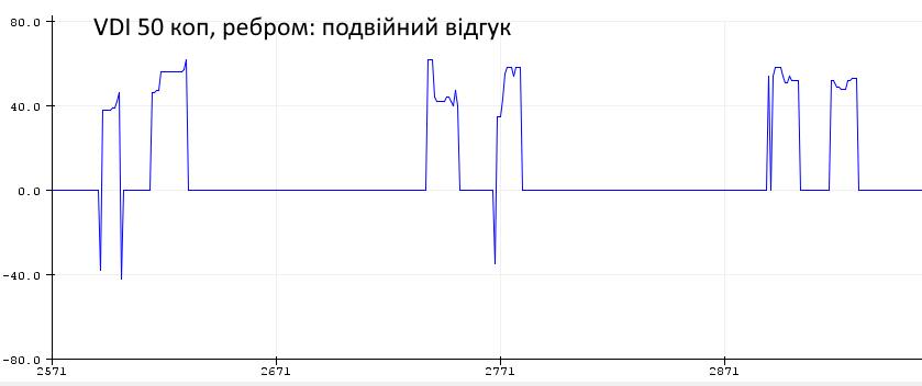 При "повітряних тестах" (статика, але з рухомою ціллю) виявив досить цікавий ефект. При переміщенні монети (50 коп., Україна, 2010) паралельно котушці на відстані приблизно 10 см. ("кільце", ко-планарна) все як і повинно бути для "кольорової" цілі - "У" та "Х" відхиляються в "+", відгук одиночний (правильність фазування котушки):