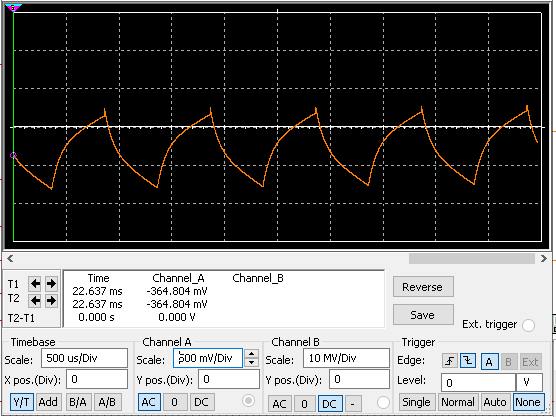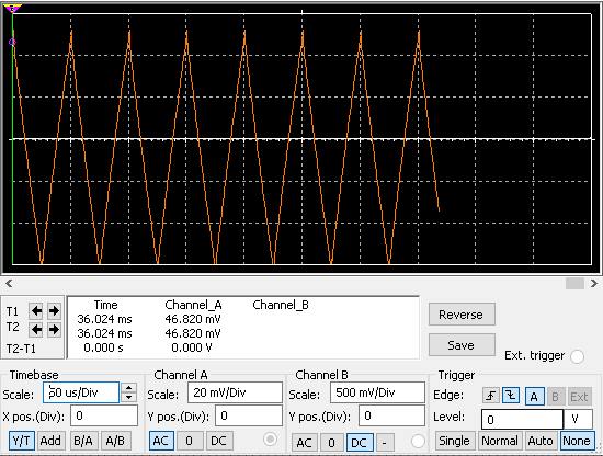 Але подивившись в симуляторі на реакцію вініл-коректора на трикутний сигнал, котрий "перетворюється" на виході в щось подібне до синуса: та меандр у вигляді "кривої пили" на 1 кГц: з перетворенням у "трикутник" на 20 кГц: відмовився від цієї затії (даремна трата наявних елементів та грошей) - низька швидкодія.